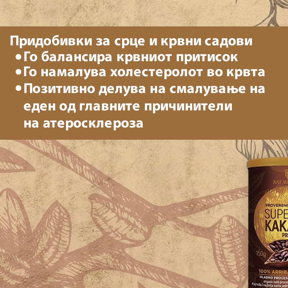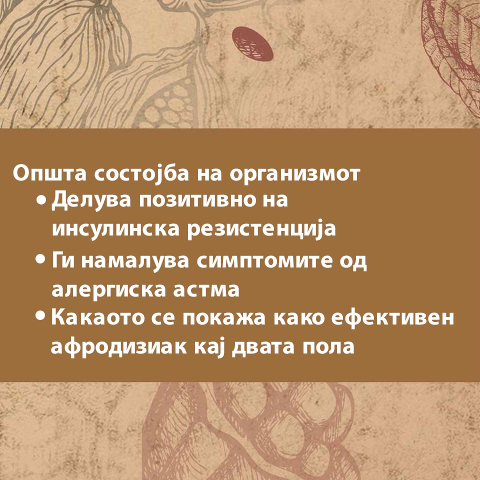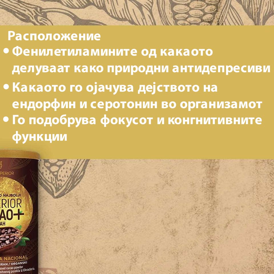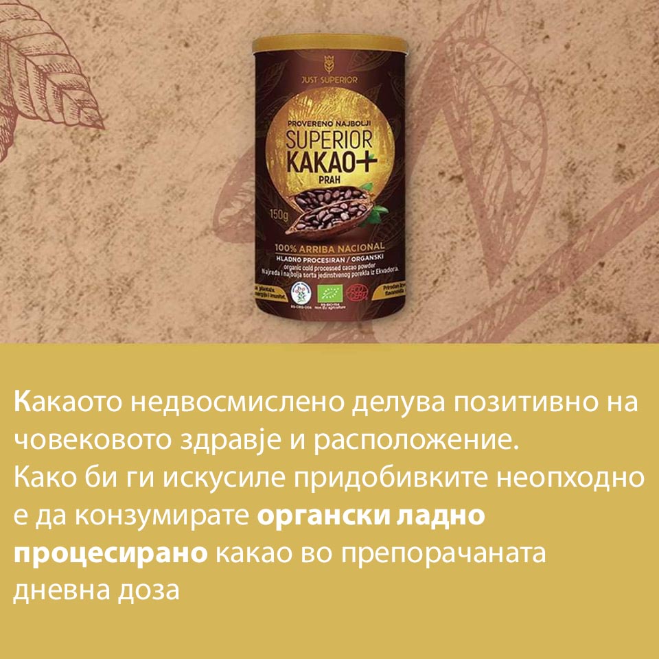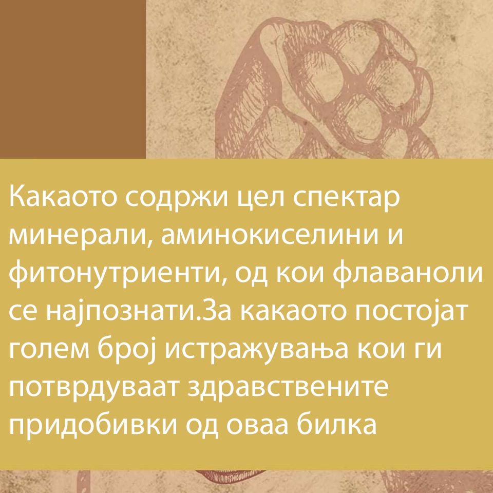Моќни придобивки од внимателно избрани какао Какаото е една од најфасцинантните супер храна што ни ја даде природата. Содржи целиот спектар на минерали, аминокиселини и фитонутриенти, од кои флаванолите се веројатно најпознати.