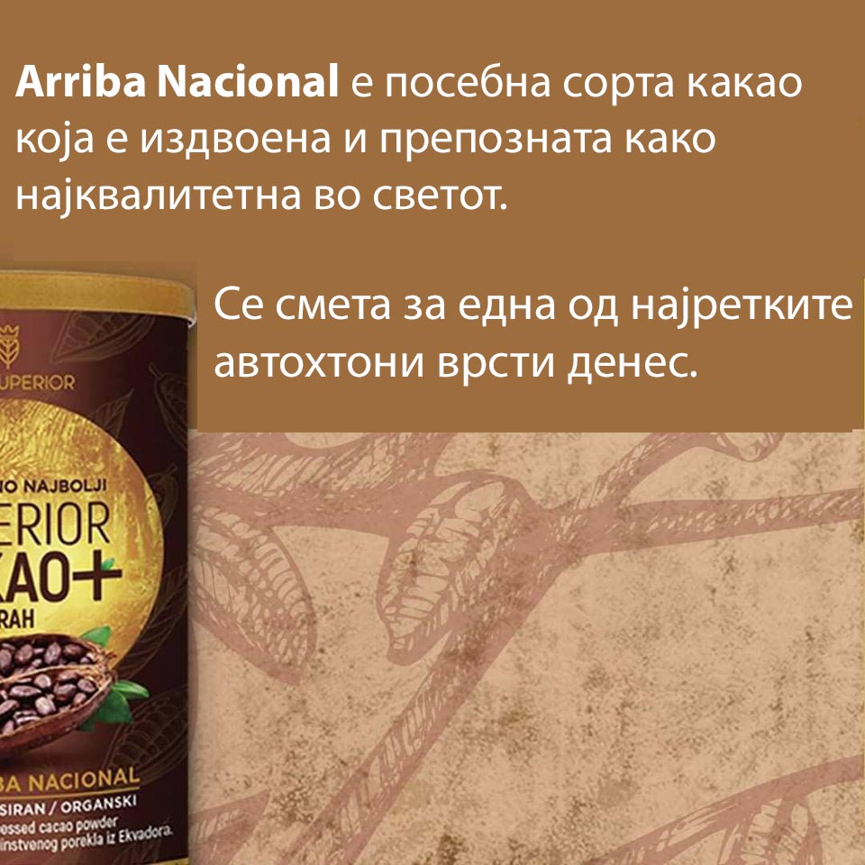 Arriba Nacional е најценетата и најретката домородна сорта на какао во светот. Докажани здравствени придобивки (затоа што само овој какао во прав содржи доволно флавоноиди и други фитонутриенти). Супериорната Ариба доаѓа директно од неколку насади од само една област на Еквадор, која се смета за историски дом на какаото.